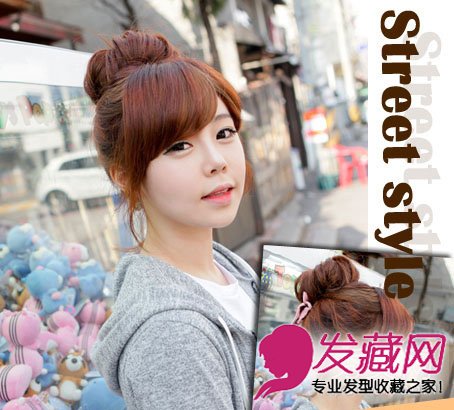 近几年大热的丸子头毫无过时落伍的趋势,在春夏之际用丸子头搭配任何衣服都自然流露出别样的清新可爱,橙棕色的染发更是突出。