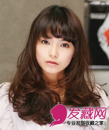 碎发的斜刘海搭配上发尾蓬松的厚重卷发造型,显得气质迷人。深棕色的染发造型也将肤色变得更加白皙迷人。