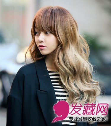 浓厚齐刘海遮住额头,显示精致小脸,棕色和亚麻色两种烫卷染发时尚感十足。