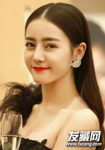 中分的直长发,将头发都梳向后侧,夹在耳朵后面,露出光洁的额头,搭配大红色口红,御姐范儿十足。