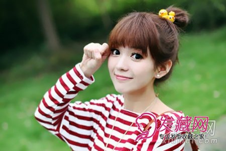 可爱发饰扎起的小丸子头看起来非常的天真可爱,俏皮无敌,搭配整齐的刘海更有减龄效果。