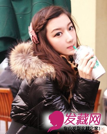 发语这款韩国发型其刘海与卷发发丝一起扎起的辫子让女生的形象更显甜美可爱,而且直接用发丝将卷发扎起来更有韵味,也是元旦新年的一大亮点哦。