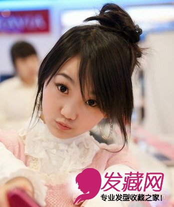 甜美乖乖女的形象,额间长长的斜刘海遮盖住了半边额头和脸颊,另一侧的鬓发同样长而厚,带有些90后非主流发型的味道,脑后高高的发髻扎发,嘟嘟嘴很可爱。