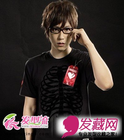 这是一款很适合小男生的男生时尚发型,前额刘海修剪出层次感再注入纹理烫造型,让发丝更具蓬松感,浅棕色染发提升了潮流范,乖乖男的个性中彰显出叛逆的个性。搭配一副黑色边框眼镜,时尚气息大增。