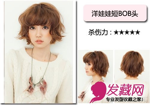 洋娃娃短BoB发尾外翘更可爱。浅色调蓬松内卷短BoB洋溢浓浓西洋风。看似随意却不显得凌乱,连原本呆板的齐刘海也被刻意抓出了几缕卷度,营造出一种洋娃娃般的甜美感。而栗子色的发色对于皮肤白皙的亚洲女孩来说更添好气色。