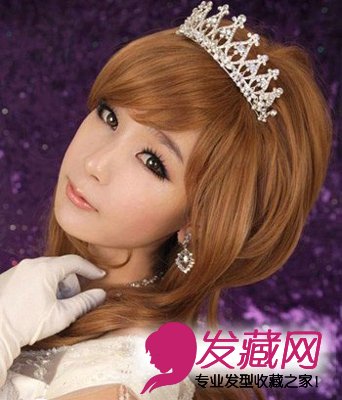 中长发发型,总是很受女生欢送,修枝出档次感的发丝,打造成疏松的头顶,联合厚重斜刘海的发型设想,,王冠发箍的粉饰,既共同又时髦,公主气质出现,润饰过宽的额头,彰显精巧的四方脸,制造出小脸靓女的抽象,选择金色色染发色彩。
