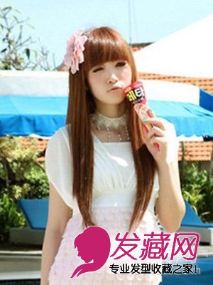 发型重点:柔顺直发向来都是男人的最爱,淡淡红色挑染,为发型添入几分甜美,整齐的刘海到眼睛,更可爱更能修饰脸颊,粉色的小花发饰,更清新纯美的小女生味道。
