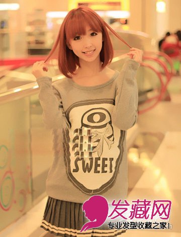 发型,纯净甜美,自然分开的齐刘海可爱瘦脸,而又有小萝莉气息。暖色系的发色青春时尚!