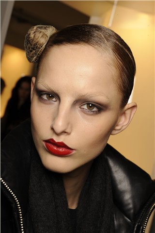 既然今年一直劲吹着80复古风,那么Alessandro Dell’Acqua 09秋冬的秀场,模特们也以这种发型出场就不以为奇了。造型师搭配金棕色泽的妆容,整体感觉非常强势,弥漫着女强人的气场。既然不对称,对比是关键,头顶的发量尽可能梳到一边,然后在一侧做出夸张惹眼的造型,Alessandro Dell’Acqua秀场则是大大的波浪。