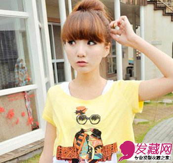 厚厚的刘海修出小巧可爱的萝莉脸,加上高高扎起的丸子头,非常甜美活泼,深黄色的