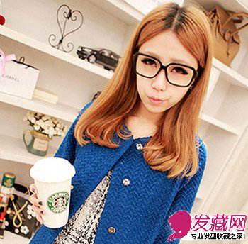 中分的长刘海夹在耳后,显得特别大方自信,中长直发发梢微微弯曲打破了直发带给人的僵硬感,金棕色的染发加上大大的黑框眼镜,潮范十足。