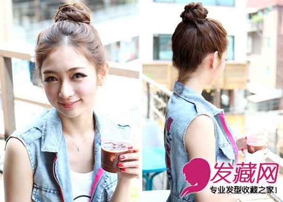 当然非这款丸子头莫属了。模特简短的头发被扎成一个高高的丸子头,配上丸子头假发圈,倍显靓丽。