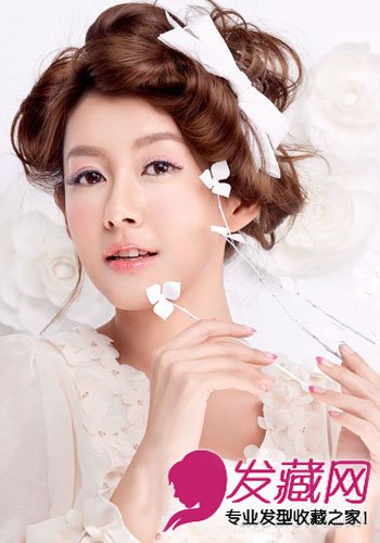 厚重的大波浪卷发,简单梳一个包包头浪费了卷花也太学生气,松散的盘起后再搭配粉嫩的大蝴蝶结,甜美又不失妩媚,适合轻熟女造型。
