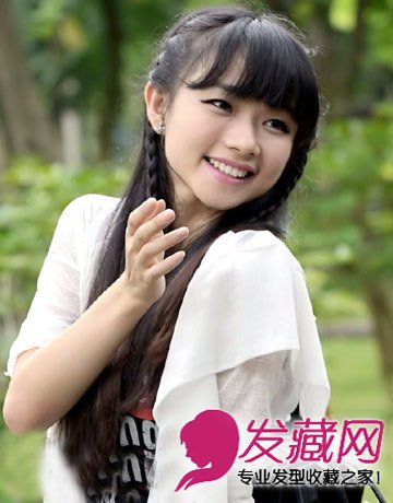 黑色发丝采用编发的方式从将两边的发丝编起,齐刘海发型尽显精致五官,这款氧气十足的公主头充满了清新可爱的气息。