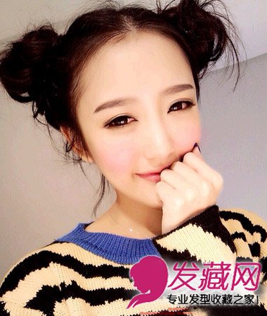 中分无刘海分发,少女系的双丸子头扎发髻发型也是清爽扮靓的
