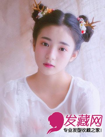 这一款中国娃娃发型具有民族特色,也是少女们可以尝试的个性发型,盘起两个小发髻,装饰小鹿头,粉嫩的妆容,森女最爱。