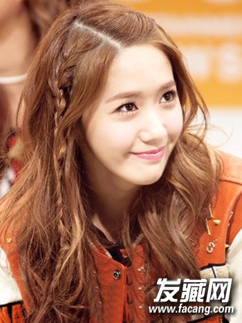 萌妹纸们偏爱的一款韩式卷发扎发造型,巧克力色染发最显肤白,侧分的蓬松卷发搭配编发设计更显俏皮。