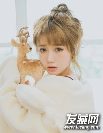 小小的蓬松感的丸子头发型,不仅时尚而且有气质感,整个造型勾勒出无比的时尚感来,空气刘海时尚大气。