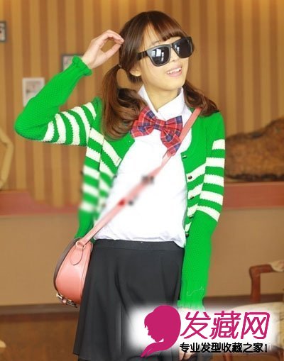 学生气息的双马尾,十分的天真可爱,搭配齐刘海更萝莉减龄,再配上八字形的墨镜超个性怪异的感觉。