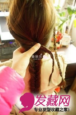 将2边的三股辫塞到中间的辫子中间,用夹子固定。