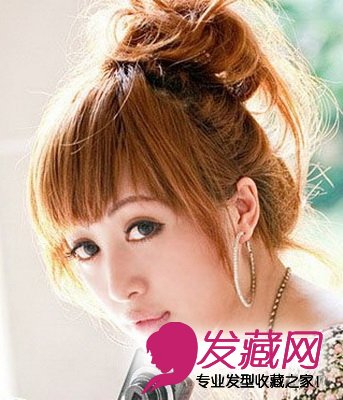 清新的丸子头造型是最简单的一款韩式发型扎法,头发高扎起丸子头,清新可人,给人以夏天清爽的感觉,棕色的