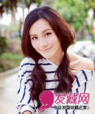微卷发扎双马尾,纯真可爱,乖巧甜美,搭配露肩的条纹衫更加凉爽甜美。