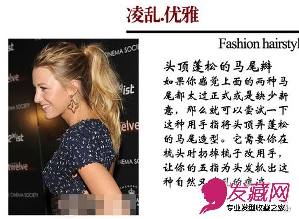 如果你感觉上面的两种马尾都太过正式或是缺少新意,那么就可以尝试一下这种用手指将头顶弄蓬松的马尾造型。它需要你在梳头时扔掉梳子改用手,让你的五指为头发抓出这种自然又凌乱的痕迹。
