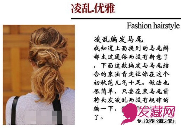 我知道上面提到的马尾辫都太过通俗而没有新意了,下面这款编发与马尾结合的束法肯定让你在这个初秋范儿气十足。做法也很简单,只要在束马尾前将头发凌乱而没有规律的编一下,然后再束起就好了。