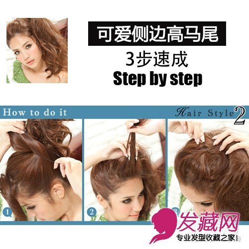 以耳朵上方为基点,将头压低绑一个微侧的高马尾固定。
