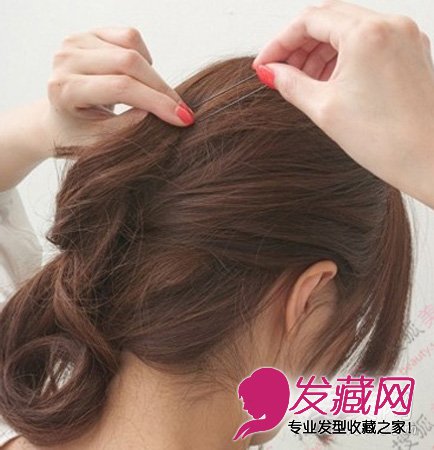 将头顶的头发混入下半部分的头发中去,用每卷一圈便固定一根发夹的方式固定好,这样可以保证头发不会散开。