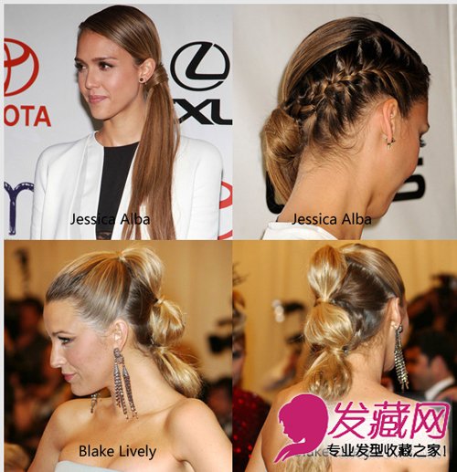 Jessica Alba和Blake Lively分别示范高低马尾造型。将头发一侧先做编发处理,然后与其他头发一起在相反一侧绑成低马尾,光洁整齐的低马尾优雅时尚,看似简单的低马尾暗藏玄机,展现出街拍女王应有的时尚sense。