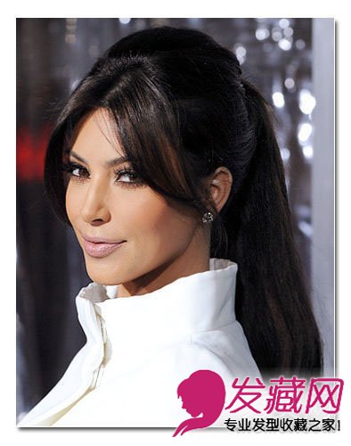 社会名媛金·卡戴珊(Kim Kardashian)的发型一贯属于亚洲人的黑色调,不过这次她用马尾辫做出了一个复古的造型,中分的刘海和马尾,而两边的头发非常圆滑,一种简单而又充满着无限女人味儿的发型。