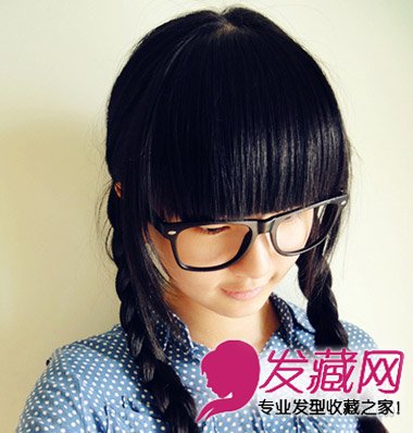 小清新最爱齐刘海双马尾发辫,低扎发辫简约自然,齐平刘海发丝修颜,搭配眼睛呆萌可爱。