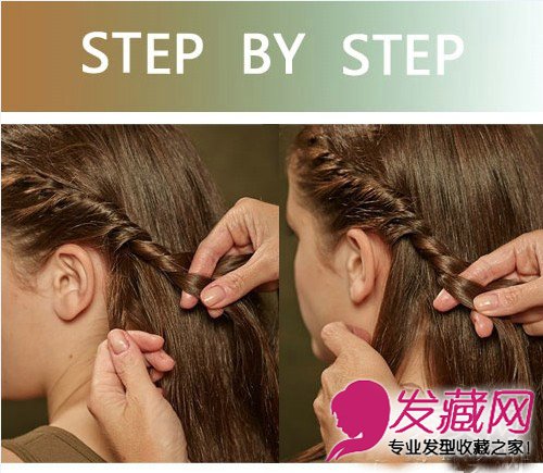从左右两侧前额边上挑出两束头发,向后方编织,然后再从下面头发中挑出一束,续编下一个步骤。