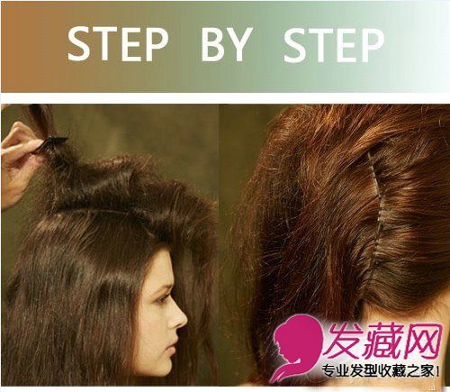 从上面第一个夹子开始,将这一横向区域的头发向左边扭转成一股,然后向上推一点,做成隆起的样子,用夹子固定扭转结处。