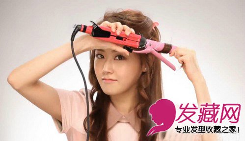 step3:用卷发棒从耳朵位置开始分区卷头发,先将头顶的头发夹起。