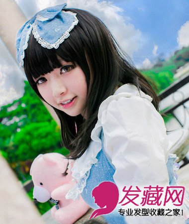 ,弧度感圆润可爱的中长发,碎剪的平刘海发丝瘦脸,两侧发丝发尾处自然内扣清新可爱。