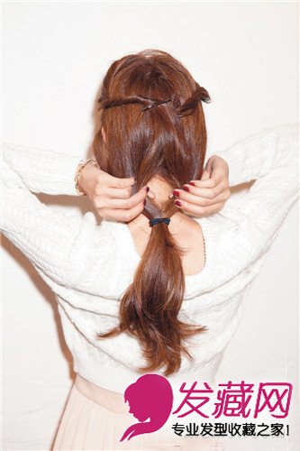 4、将后面的头发和早上拧起的发梢一起,在脖颈处扎成一束。在打结处上方穿入手指,像右图那样空出一个洞。