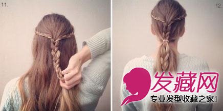 将刚才分好的三股头发,再编发,可以编得松一点,用皮筋把编好的麻花和剩下的头发束成一个低马尾。