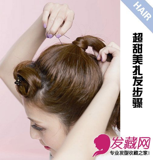 step3:从绑好的马尾中取出一束头发缠绕橡皮筋后用发夹固定。