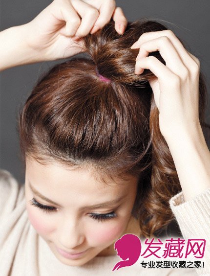 step1:将长发绑成高耸的马尾后,用手将发丝撕拉蓬松。