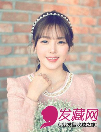 ,露出若隐若现的额头,精致的发箍,搭配饱满的脸型,优雅大方。