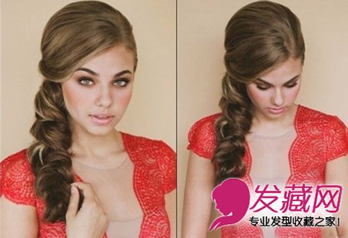 这是一款无刘海露额的亚麻色卷发扎发,这款发型的发色很能显示出女生的皮肤白皙,并且有几分熟女气质,搭配上深V的礼服,显得非常的性感成熟、