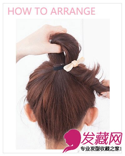 step 2:马尾放进蝴蝶结饰品的橡皮筋中,再折叠扎起。