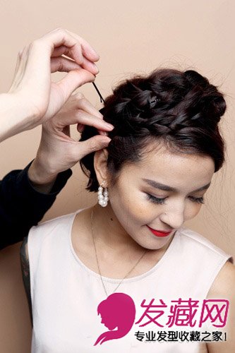 将前发的发辫逆向环绕,固定在后发打造发辫的下一层。