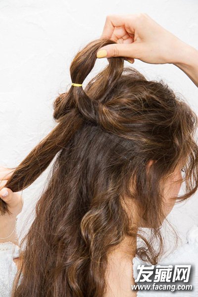 step3:再将发尾从橡皮筋上方的洞中穿插过来。