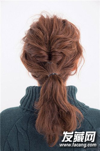 把头发全部集中在后颈线,用发圈扎起。最后戴一个装饰发圈。