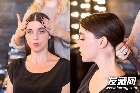 第三步:用发胶沿着发际线涂抹,使长发更服帖亮泽。用发梳梳出一个低马尾。