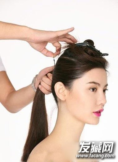 将U形区的头发全部梳至一侧后,同发卡固定好,然后将剩余的头发全部绑成马尾。马尾最好绑高一些,给人感觉比较精神活泼。