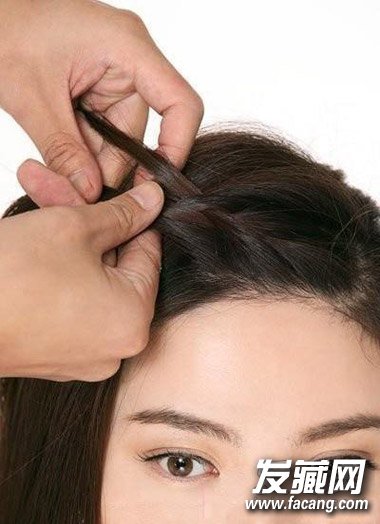 松掉U形区的发卡,先选出U形区最前面的一束头发,分成三股开始编制麻花辫。小编建议不要编的太紧,适当的松散会看上去更加自然。